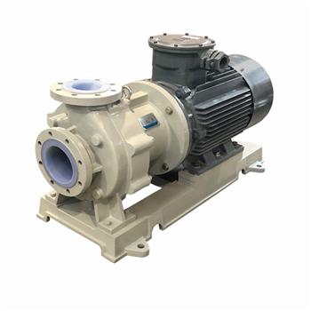 产品介绍: IMC型氟塑料合金磁力泵,过流部件使用氟塑料及合金复合材料制造,是应用磁力学原理,利用内外永磁体传动,实现扭矩无接触传递,当电动机带动外转子总成旋转时,通过磁场的作用磁力线穿过隔离套带动内转子总成和叶轮同步旋转,外转子旋转时隔离套静止,隔离套将介质密封,从而达到无泄漏输送介质的目的。解决了机械传动泵的轴封跑、冒、滴现象。